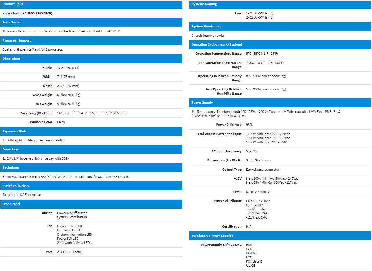 شاسی SuperChassis 745BAC-R1K23B از نوع 4U Full Tower است که به کاربران این امکان را میدهد تا حداکثر از مادربردهایی با اندازه E-ATX (13.68 x 13 inch) استفاده کنند. این شاسی با پشتیبانی از پردازندههای دوگانه و تکگانه اینتل و AMD، انعطافپذیری بالایی را برای پیادهسازی انواع سرورهای پردازشی و ذخیرهسازی ارائه میدهد.
