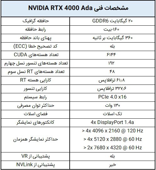 - RTX 4000 Ada برای کسانی که به دنبال کارایی مناسب با مصرف انرژی کم هستند و نیاز به یک کارت گرافیک برای کارهای روزمره و اجرای بازیهای استاندارد دارند.
